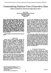 Tsang, D. ORCID: https://orcid.org/0000-0003-1671-5521 (2017) Contextualizing employee voice of innovative China: tradition and modernity within the knowledge-intensive sector. In: 7th Annual International Conference on Human Resource Management and Personal Development in the Digital Age, 11-12 Dec 2017, Singapore. doi: 10.5176/2251-2349_HRMPD17.28