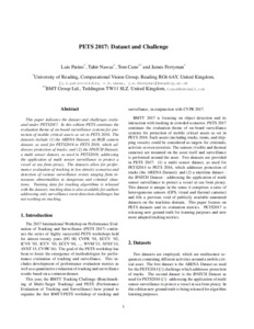 This paper indicates the dataset and challenges evaluated under PETS2017. In this edition PETS continues the evaluation theme of on-board surveillance systems for protection of mobile critical assets as set in PETS 2016. The datasets include (1) the ARENA Dataset; an RGB camera dataset, as used for PETS2014 to PETS 2016, which addresses protection of trucks; and (2) the IPATCH Dataset; a multi sensor dataset, as used in PETS2016, addressing the application of multi sensor surveillance to protect a vessel at sea from piracy. The datasets allow for performance evaluation of tracking in low-density scenarios and detection of various surveillance events ranging from innocuous abnormalities to dangerous and criminal situations. Training data for tracking algorithms is released with the dataset; tracking data is also available for authors addressing only surveillance event detection challenges but not working on tracking.