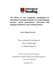 Awwad, A. A. (2017) The effects of task complexity manipulated by intentional reasoning demands on second language learners’ speech performance: interaction with language proficiency and working memory. PhD thesis, University of Reading.