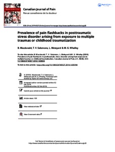 MacDonald, B., Salomons, T. V., Meteyard, L. and Whalley, M. G. (2018) Prevalence of pain flashbacks in post-traumatic stress disorder arising from exposure to multiple traumas or childhood traumatization. Canadian Journal of Pain, 2 (1). pp. 48-56. ISSN 2474-0527 doi: 10.1080/24740527.2018.1435994