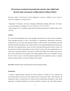 Baker, B. C., German, I. M., Chippindale, A. M. ORCID: https://orcid.org/0000-0002-5918-8701, Mcewan, C. E. A., Stevens, G. C., Colquhoun, H. M. and Hayes, W. ORCID: https://orcid.org/0000-0003-0047-2991 (2018) Nitroarylurea-terminated supramolecular polymers that exhibit facile thermal repair and aqueous swelling-induced sealing of defects. Polymer, 140. pp. 1-9. ISSN 0032-3861 doi: 10.1016/j.polymer.2018.02.029