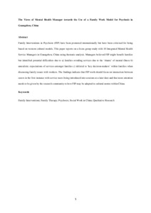 Family Interventions in Psychosis (FIP) have been promoted internationally but have been criticised for being based on western cultural models. This paper reports on a focus group study with 10 Integrated Mental Health Service Managers in Guangzhou, China using thematic analysis. Managers believed FIP might benefit families but identified potential difficulties due to (a) families avoiding services due to the ‘shame’ of mental illness (b) unrealistic expectations of services amongst families (c) deferral to ‘key decision-makers’ within families when discussing family issues with workers. The findings indicate that FIP work should focus on interaction between carers in the first instance with service users being introduced into sessions at a later date and that more attention needs to be given by the research community to how FIP may be adapted to cultural norms within China.