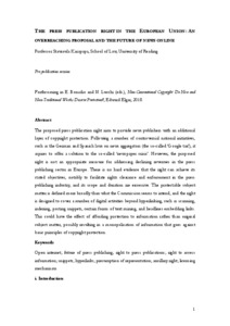 The proposed press publication right aims to provide news publishers with an additional layer of copyright protection. Following a number of controversial national initiatives, such as the German and Spanish laws on news aggregators (the so-called ‘Google tax’), it aspires to offer a solution to the so-called ‘newspaper crisis’. However, the proposed right is not an appropriate measure for addressing declining revenues in the press publishing sector in Europe. There is no hard evidence that the right can achieve its stated objectives, notably to facilitate rights clearance and enforcement in the press publishing industry, and its scope and duration are excessive. The protectable subject matter is defined more broadly than what the Commission seems to intend, and the right is designed to cover a number of digital activities beyond hyperlinking, such as scanning, indexing, posting snippets, certain forms of text mining, and headlines embedding links. This could have the effect of affording protection to information rather than original subject matter, possibly resulting in a monopolisation of information that goes against basic principles of copyright protection.