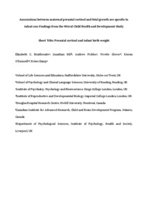 Braithwaite, E. C., Hill, J., Pickles, A., Glover, V., O'Donnell, K. and Sharp, H. (2018) Associations between maternal prenatal cortisol and fetal growth are specific to infant sex: findings from the Wirral Child Health and Development Study. Journal of Developmental Origins of Health and Disease, 9 (4). pp. 425-431. ISSN 2040-1752 doi: 10.1017/S2040174418000181