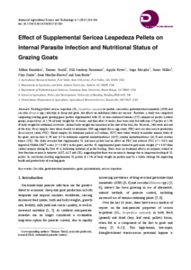 Feeding pelleted sericea lespedeza (SL; Lespedeza cuneata) on pasture can reduce gastrointestinal nematode (GIN) and coccidia (Eimeria spp.) infection in sheep and goats, but effects on nutritional status are unclear. Therefore, a study was completed comparing yearling goats grazing grass pasture supplemented with SL or non-condensed tannins (CT) commercial pellets (control group), respectively, at 1.5% of body weight for 14 weeks, and then after 14 weeks, they were only fed with non-CT pellets at 2.5% of body weight for additional six weeks. Animal body weight was measured at the start of the trial, the 7th week, 14th week and end of the trial. Fecal samples were taken weekly to determine GIN egg output (fecal egg count; FEC) and coccidial oocyst production (fecal oocyst count; FOC). Blood samples (to determine packed cell volume; PCV) were taken weekly to monitor anemia status of the goats, and on days 0, 98 and 137 to determine aspartate aminotransferase (AST), alanine aminotransferase (ALT) and creatine kinase (CK). The study revealed that supplemental SL leaf meal pellets had no effect on FEC, but reduced FOC (P < 0.05) and improved FAMACHA© scores (P < 0.001) in the goats, and the SL supplemented goats tended to gain more weight (P = 0.07) than control animals during the first 49 d, following initiation of pellet feeding. There were no treatment effects on enzymes related to liver function or muscle turnover (AST, ALT and CK), suggesting that there was no muscle damage due to long-term feeding of SL pellets. In conclusion, feeding supplemental SL pellets at 1.5% of body weight on pasture may be a viable strategy for improving health and productivity of yearling goats.