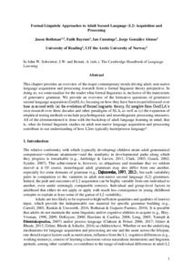 This chapter provides an overview of the major contemporary trends driving adult, non-native language acquisition and processing research from a formal linguistic theory perspective. In doing so, we contextualize for the reader what formal linguistics is, inclusive of the main tenets of generative grammar. We provide an overview of the formative questions of generative second language acquisition (GenSLA), focusing on how they have been recast/refocused over time in accord with: (a) the evolution of formal linguistic theory, (b) insights from GenSLA’s own research over three decades and other paradigms of SLA, as well as (c) the expansion of empirical testing methods to include psycholinguistic and neurolinguistic processing measures. All of the aforementioned is done with the backdrop of adult language learning in mind; that is, what do formal linguistic studies on adult non-native language acquisition and processing contribute to our understanding of how L2ers typically learn/process language?