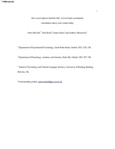 McLeod, P., Reed, N., Gilson, S. and Glennerster, A. ORCID: https://orcid.org/0000-0002-8674-2763 (2008) How soccer players head the ball: a test of optic acceleration cancellation theory with virtual reality. Vision Research, 48 (13). pp. 1479-1487. ISSN 0042-6989 doi: 10.1016/j.visres.2008.03.016