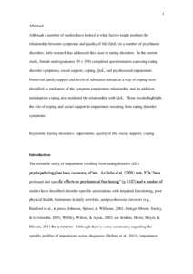 Although a number of studies have looked at what factors might mediate the relationship between symptoms and quality of life (QoL) in a number of psychiatric disorders, little research has addressed this issue in eating disorders. In the current study, female undergraduates (N = 339) completed questionnaires assessing eating disorder symptoms, social support, coping, QoL, and psychosocial impairment. Perceived family support and levels of substance misuse as a way of coping were identified as mediators of the symptom-impairment relationship and, in addition, maladaptive coping also mediated the relationship with QoL. These results highlight the role of coping and social support in impairment resulting from eating disorder symptoms.