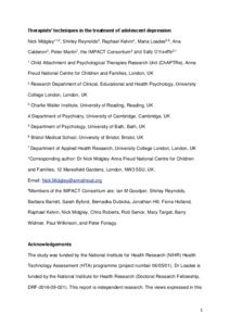 Midgley, N., Reynolds, S., Kelvin, R., Loades, M., Calderon, A., Martin, P., IMPACT Consortium, t. and O'Keefe, S. (2018) Therapists' techniques in the treatment of adolescent depression. Journal of Psychotherapy Integration, 28 (4). pp. 413-428. ISSN 1053-0479 doi: 10.1037/int0000119