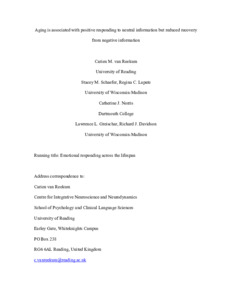 Publisher Statement This is a pre-copy-editing, author-produced PDF of an article accepted for publication in Social Cognitive and Affective Neuroscience following peer review. The definitive publisher-authenticated version: 'Aging is associated with positive responding to neutral information but reduced recovery from negative information', Carien M. van Reekum, Stacey M. Schaefer, Regina C. Lapate, Catherine J. Norris, Lawrence L. Greischar and Richard J. Davidson. Soc Cogn Affect Neurosci (2010) doi: 10.1093/scan/nsq031 is available online at http://dx.doi.org/10.1093/scan/nsq031