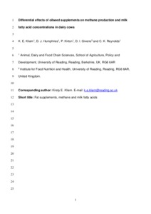 Kliem, K. E. ORCID: https://orcid.org/0000-0002-0058-8225, Humphries, D. J., Kirton, P. ORCID: https://orcid.org/0009-0001-1941-003X, Givens, D. I. ORCID: https://orcid.org/0000-0002-6754-6935 and Reynolds, C. K. ORCID: https://orcid.org/0000-0002-4152-1190 (2019) Differential effects of oilseed supplements on methane production and milk fatty acid concentrations in dairy cows. Animal, 13 (2). pp. 309-317. ISSN 1751-7311 doi: 10.1017/S1751731118001398
