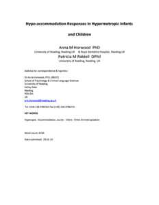Publisher Statement This article has been accepted for publication in British Journal of Ophthalmology (BJO). The definitive copyedited, typeset version Hypo-accommodation responses in hypermetropic infants and children Anna M Horwood, Patricia M Riddell, Br J Ophthalmol doi:10.1136/bjo.2009.177378 is available online at : http://bjo.bmj.com