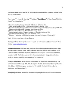 Lee, T.-H., Greening, S. G., Ueno, T., Clewett, D., Ponzio, A., Sakaki, M. ORCID: https://orcid.org/0000-0003-1993-5765 and Mather, M. (2018) Arousal increases neural gain via the locus coeruleus-norepinephrine system in younger adults but not in older adults. Nature Human Behaviour, 2 (5). pp. 356-366. ISSN 2397-3374 doi: 10.1038/s41562-018-0344-1