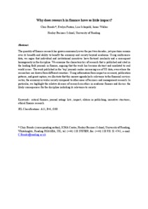 The quantity of finance research has grown enormously over the past two decades, yet questions remain over its breadth and ability to benefit the economy and society beyond academia. Using multisource data, we argue that individual and institutional incentives have fostered insularity and a consequent homogeneity in the discipline. We examine the characteristics of research that is published and cited in the leading field journals in finance, arguing that the work has become abstract and unrelated to real world issues. The work published in the ‘top’ journals makes increasing use of US data, even where the researchers are drawn from different countries. Using information from impact assessment, publication patterns, and grant capture, we illustrate that this narrow agenda lacks relevance to the financial services sector, the economy or wider society compared to other areas of business and management research. In particular, we highlight the relative absence of research on ethics in academic finance and discuss the likely consequences for the discipline including its relevance to society.