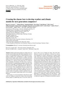 Lawrence, B. N. ORCID: https://orcid.org/0000-0001-9262-7860, Rezny, M., Budich, R., Bauer, P., Behrens, J., Carter, M., Deconinck, W., Ford, R., Maynard, C., Mullerworth, S., Osuna, C., Porter, A., Serradell, K., Valcke, S., Wedi, N. and Wilson, S. (2018) Crossing the chasm: how to develop weather and climate models for next generation computers? Geoscientific Model Development, 11 (5). pp. 1799-1821. ISSN 1991-9603 doi: 10.5194/gmd-11-1799-2018