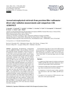 Kazadzis, S., Veselovskii, I., Amiridis, V., Gröbner, J., Suvorina, A., Nyeki, S., Gerasopoulos, E., Kouremeti, N., Taylor, M., Tsekeri, A. and Wehrli, C. (2014) Aerosol microphysical retrievals from precision filter radiometer direct solar radiation measurements and comparison with AERONET. Atmospheric Measurement Techniques, 7 (7). pp. 2013-2025. ISSN 1867-8548 doi: 10.5194/amt-7-2013-2014