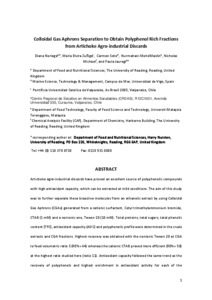 Artichoke agro-industrial discards have proved an excellent source of polyphenolic compounds with high antioxidant capacity. The aim of this study was to further separate these bioactive molecules from an ethanolic extract by using Colloidal Gas Aphrons (CGAs) generated from a cationic surfactant, Cetyl trimethylammonium bromide, CTAB (1 mM) and a nonionic one, Tween 20 (10 mM). Total proteins, total sugars, total phenolic content (TPC), antioxidant capacity (AOC) and polyphenolic profile were determined in the crude extracts and CGA fractions. Highest recovery was obtained with the nonionic Tween 20 at CGA to feed volumetric ratio 5 (RE% = 64) whereas the cationic CTAB proved more efficient (RE% = 58) at the highest ratio studied here (ratio 11). Antioxidant capacity followed the same trend as the recovery of polyphenols and highest enrichment in antioxidant activity for each of the surfactants (1.5 for Tween 20 and 1.4 for CTAB) was obtained at those conditions that led to maximum recovery. Highest selectivity was obtained with CTAB. Electrostatic interactions drove the separation with the cationic surfactant whereas with Tween 20 hydrophobic interactions were predominant. Polyphenolic profile of feed and CGAs fractions comprised mainly mono and dicaffeoylquinic acids and a small proportion of flavones. In most of the cases no enrichment of any particular polyphenol was found in CGAs samples. However, with Tween and at ratios 5 and 11 CGAs were enriched in dicaffeoylquinic acid. Future research should focus on assessing if the surfactant could also offer any advantage to the formulation of these polyphenols.