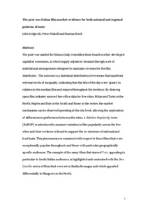 The post-war market for films in Italy resembles those found in other developed capitalist economies, in which supply adjusts to demand through a set of institutional arrangements designed to maximize revenue for the film distributor. The outcome is a statistical distribution of revenues that manifests extreme levels of inequality, indicating that the hits of the day were ‘giants’ in relation to the median film and enjoyed throughout the territory. By drawing upon film industry sourced box-office data for five cities, Milan and Turin in the North; Naples and Bari in the South and Rome in the centre, the market mechanism can be observed operating at the city level, allowing the exploration of differences in preferences between the cities. A Relative Popularity Index (RelPOP) is introduced to measure variation in film popularity across the five cities and clear evidence is found to support the co-existence of national and local taste. This phenomenon is examined with respect to those films that were exceptionally popular throughout, and those with particular geographically specific audiences. The example of the many films that starred Totò, appealing in particular to South Italian audiences, is highlighted and contrasted with the Don Camillo series of films that were set in Emilia Romagna and which appealed differentially to filmgoers in the North.