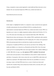 In this chapter we highlight the benefits of a comparative corpus-assisted discourse approach to health communication (Jaworska and Kinloch 2018) by examining discursive representations of postnatal depression (PND) in lay, medical and media accounts. PND is an important case to study; it is a highly stigmatised condition which in the UK affects 10-15 in every 100 women and is the leading cause of maternal death (Oates 2003; NHS 2016). Our study endeavours to contribute to a better understanding of the lived experience of PND through a comparative analysis of discourses about the condition produced by mothers in an online discussion forum, the medical profession and the UK print media. We focus specifically on the ways in which the condition – PND – is discursively constructed across different types of texts and the extent to which medical and media discourses around PND are re-contextualised by mothers and how mothers position themselves vis-à-vis the social stigma. To this end, we examine the use of the acronym PND (as opposed to the term postnatal depression) in three large data sets (corpora) including: 1) lay narratives sourced from Mumsnet, 2) information by clinicians for lay people and 3) articles about PND from British newspapers. Analysis of a large dataset of language on a particular topic has clear potential benefits for the study of health language, particularly in gathering evidence of discursive practices around a particular user group or condition.