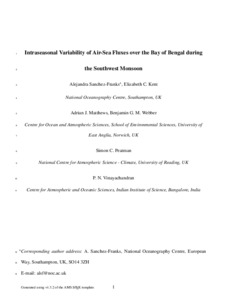 Sanchez-Franks, A., Kent, E. C., Matthews, A. J., Webber, B. G. M., Peatman, S. C. and Vinayachandran, P. N. (2018) Intraseasonal variability of air-sea fluxes over the Bay of Bengal during the southwest monsoon. Journal of Climate, 31 (17). pp. 7087-7109. ISSN 1520-0442 doi: 10.1175/JCLI-D-17-0652.1