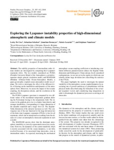 De Cruz, L., Schubert, S., Demaeyer, J., Lucarini, V. ORCID: https://orcid.org/0000-0001-9392-1471 and Vannitsem, S. (2018) Exploring the Lyapunov instability properties of high-dimensional atmospheric and climate models. Nonlinear Processes in Geophysics, 25 (2). pp. 387-412. ISSN 1607-7946 doi: 10.5194/npg-25-387-2018