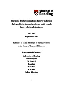 Aziz, A. (2018) Electronic structure simulations of energy materials: chalcogenides for thermoelectrics and metal-organic frameworks for photocatalysis. PhD thesis, University of Reading. doi: 10.48683/1926.00077930