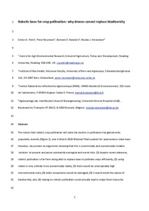 The notion that robotic crop pollination will solve the decline in pollinators has gained wide popularity recently (Fig. 1), and in March 2018 Walmart filed a patent for autonomous robot bees. However, w present six arguments showing that this is a technically and economically inviable 'solution' at present and poses substantial ecological and moral risks: (1) despite recent advances, robotic pollination is far from being able to replace bees to pollinate crops efficiently; (2) using robots is very unlikely to be economically viable; (3) there would be unacceptably high environmental costs; (4) wider ecosystems would be damaged; (5) it would erode the values of biodiversity; and, (6) relying on robotic pollination could actually lead to major food insecurity.
