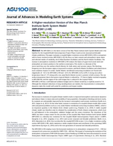 Müller, W. A., Jungclaus, J. H., Mauritsen, T., Baehr, J., Bittner, M., Budich, R., Bunzel, F., Esch, M., Ghosh, R., Haak, H., Ilyina, T., Kleine, T., Kornblueh, L., Li, H., Modali, K., Notz, D., Pohlmann, H., Roeckner, E., Stemmler, I., Tian, F. and Marotzke, J. (2018) A higher-resolution version of the Max Planck Institute Earth System Model (MPI-ESM1.2-HR). Journal of Advances in Modeling Earth Systems, 10 (7). pp. 1383-1413. ISSN 1942-2466 doi: 10.1029/2017ms001217