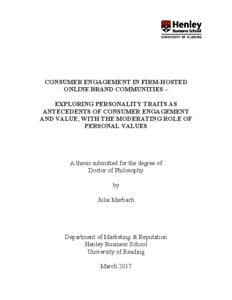 Marbach, J. (2017) Consumer engagement in firm-hosted online brand communities – exploring personality traits as antecedents of consumer engagement and value, with the moderating role of personal values. PhD thesis, University of Reading.