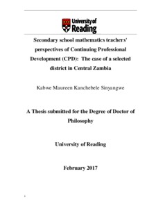 Sinyangwe, K. M. K. (2017) Secondary school mathematics teachers' perspectives of Continuing Professional Development (CPD): the case of a selected district in Central Zambia. PhD thesis, University of Reading.