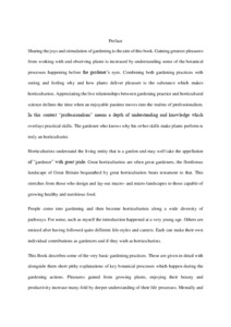 Readers are provided with a well illustrated account of basic gardening practices and their underlying principles. Learning achievements are listed at the ends of each chapter identifying practical skills and underlying principles applicable to each area of husbandry. A Preamble offers advice describing the tools and equipment required for successful gardening including the use of protected structures such as glasshouses. The observation of health and safety rules is stressed especially where the garden also provides for children and pets. Simple tests which identify the conditions conducive for seed germination and plant growth are presented in chapter 1. These are accompanied by elementary descriptions of energy gathering by photosynthesis and its use in respiration, the distribution and utilisation of energy via organic materials and the manner by which plants grow from seedlings into garden produce are described. A series of simple tests using commonplace kitchen equipment, well-lit window sills or a greenhouse bench are explained. Soil development and care are covered in chapter 2 plus the use of healthy high-quality soil for growing potatoes and bulb onions. Included are discussions of soil components, conservation and careful husbandry. This chapter provides the gardener with explanations of the skills required for land preparation by adding organic matter, primary digging, secondary cultivation and the preparation of soil prior to and including planting processes. The range of soil types is explained, the ways in which these can be tested for the promotion of satisfactory crop growth, the use of fertilisers and liming, effects of deficiencies and excesses of nutrients are described. Legume crops are the backbone for successful vegetable gardening and their cultivation is described in chapter 3 including a simple understanding of seed production. Means for propagation in greenhouses and direct planting into the garden and the processes which these entail for cold tolerant and chilling susceptible legumes are explained. Preventing and encouraging variation in growth and reproduction are essential aspects of plant development, the structure of flowers and the passage of genetic traits between generations by pollen transfer are encapsulated in a Spiral of Life. Gardeners propagate, grow and harvest a range of small seeded vegetable crops and husbandry practices which deliver these are provided in chapter 4. The range of small seeded vegetables is explained. Details are provided for those which may be directly sown into the garden and those which for preference are germinated in the greenhouse. Understanding the visual components of plants, their underlying internal structures and the manner by which these factors influence competition in the garden governs the success of small seeded crops. Successful soft fruit growing is one of key achievements for gardeners. Practices which ensure this are delivered in chapter 5 covering strawberries, raspberries and blackcurrants with notes for other fruits. The range of types of these soft fruits, their fruiting periods and pre-planting, planting and post-plating husbandry are discussed in detail. Each of these crops grows perennially providing increasing yields for several successive years. Ensuring this productivity requires an understanding of crop care before during and after fruiting. A range of other soft fruits is also described. Included in this chapter is a discussion of the defining characteristics of monocotyledons and dicotyledons. Forms of stems, leaves and shoots are described and illustrated. Gardeners achieve vibrant displays of colour for their gardens by growing bulbous plants. These are described in Chapter 6 which gives details of the range of bulbous plants and how they will provide displays almost year-round. The successful planting in a range of locations, the structure and propagation of bulbous plants especially daffodils (Narcissus) and tulips and care before, during and after flowering is described. Comparisons are made between bulbs, corms, rhizomes and tubers together with details of flower formation, growth and blossoming. Herbaceous plants form key parts of the ornamental garden. In chapter 7 the range of hardy annual, half hardy annual, biennial and perennial and cold-tender forms is described. Propagation from seed, the usefulness of modular plants, growing techniques in the open and under protection, planning planting schemes and forms of propagation are discussed. Flowering in many ornamentals results from environmental cues which either stimulate or inhibit blossoming. These interactions are described and discussed. Skilled vegetative propagation is the hallmark of gardening proficiency and brings considerable pleasure. In chapter 8 techniques for the propagation soft-wood, semi-hardwood and hard wood cuttings, stem rhizomes and bulbs are described and illustrated. Also included are some details of micropropagation and the use of mist benches which are valuable for rooting cuttings and for weaning the products of micropropagation. A tailpiece discussed the reasons for gardeners’ successes and failures emphasising that gardening is an attempt at controlling natural processes. Consequently, there are pitfalls and problems which afflict even the most skilled and competent gardener.
