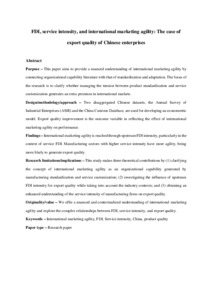 Purpose The purpose of this paper is to provide a nuanced understanding of international marketing agility by connecting organizational capability literature with that of standardization and adaptation. The focus of the research is to clarify whether managing the tension between product standardization and service customization generates an extra premium in international markets. Design/methodology/approach Two disaggregated Chinese data sets, the Annual Survey of Industrial Enterprises and the China Customs Database, are used for developing an econometric model. Export quality improvement is the outcome variable in reflecting the effect of international marketing agility on performance. Findings International marketing agility is reached through upstream FDI intensity, particularly in the context of service FDI. Manufacturing sectors with higher service intensity have more agility, being more likely to generate export quality. Research limitations/implications This study makes three theoretical contributions by clarifying the concept of international marketing agility as an organizational capability generated by manufacturing standardization and service customization; investigating the influence of upstream FDI intensity for export quality while taking into account the industry contexts; and obtaining an enhanced understanding of the service intensity of manufacturing firms on export quality. Originality/value The authors offer a nuanced and contextualized understanding of international marketing agility and explore the complex relationships between FDI, service intensity and export quality.