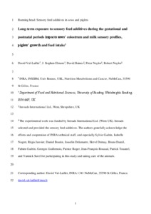 Val-Laillet, D., Elmore, J. S. ORCID: https://orcid.org/0000-0002-2685-1773, Baines, D., Naylor, P. and Naylor, R. (2018) Long-term exposure to sensory feed additives during the gestational and postnatal periods impacts sows’ colostrum and milk sensory profiles, piglets’ growth and feed intake. Journal of Animal Science, 96 (8). pp. 3233-3248. ISSN 0021-8812 doi: 10.1093/jas/sky171