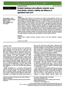 Redhead, J. W., Woodcock, B. A., Pocock, M. J. O., Pywell, R. F., Vanbergen, A. J. and Oliver, T. H. ORCID: https://orcid.org/0000-0002-4169-7313 (2018) Potential landscape-scale pollinator networks across Great Britain: structure, stability and influence of agricultural land cover. Ecology Letters, 21 (12). pp. 1821-1832. ISSN 1461-0248 doi: 10.1111/ele.13157