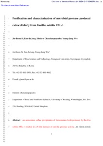 Si, J.-B., Jang, E.-J., Charalampopoulos, D. ORCID: https://orcid.org/0000-0003-1269-8402 and Wee, Y.-J. (2018) Purification and characterization of microbial protease produced extracellularly from Bacillus subtilis FBL-1. Biotechnology and Bioprocess Engineering, 23 (2). pp. 176-182. ISSN 1226-8372 doi: 10.1007/s12257-017-0495-3