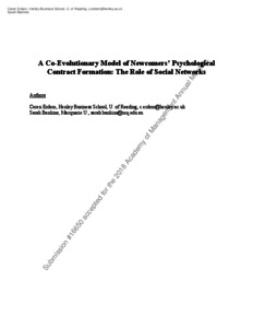 The psychological contract, the perceived mutual obligations between employer and employee, is a critical construct for understanding employment relationships and how their management informs employees’ attitudes and behaviors. Extensive work has focused on the outcomes of the contract’s operation, but there remains a paucity of research examining its formation and the role of ‘others’, within and outside the organization, in the development process. While important work has drawn on social network theorizing to explore how social interactions shape contract perceptions, the relationships posited remain largely uni- directional, highlighting another overarching limitation in the contract literature: a lack of dynamic theorizing. To address these gaps, our conceptual paper adopts a process-based lens to calibrate a co-evolutionary model of contract formation that explicates the reciprocal relationship between newcomers’ social networks and their psychological contract development. Grounded in a structuration perspective (Giddens, 1976), we draw on a range of dynamic theories to move the contract literature beyond examining static relationships to comprehensively theorize contracting as a process co-evolving with social network development in early socialization stages. We conclude by highlighting the theoretical and practical implications of our model.