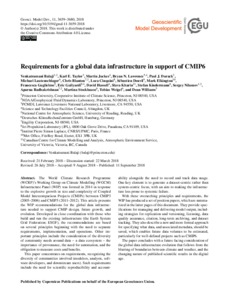 The World Climate Research Programme (WCRP)’s Working Group on Climate Modelling (WGCM) Infrastructure Panel (WIP) was formed in 2014 in response to the explosive growth in size and complexity of Coupled Model Intercomparison Projects (CMIPs) between CMIP3 (2005–2006) and CMIP5 (2011–2012). This article presents the WIP recommendations for the global data infrastruc- ture needed to support CMIP design, future growth, and evolution. Developed in close coordination with those who build and run the existing infrastructure (the Earth System Grid Federation; ESGF), the recommendations are based on several principles beginning with the need to separate requirements, implementation, and operations. Other im- portant principles include the consideration of the diversity of community needs around data – a data ecosystem – the importance of provenance, the need for automation, and the obligation to measure costs and benefits. This paper concentrates on requirements, recognizing the diversity of communities involved (modelers, analysts, soft- ware developers, and downstream users). Such requirements include the need for scientific reproducibility and account- ability alongside the need to record and track data usage. One key element is to generate a dataset-centric rather than system-centric focus, with an aim to making the infrastruc- ture less prone to systemic failure. With these overarching principles and requirements, the WIP has produced a set of position papers, which are summa- rized in the latter pages of this document. They provide spec- ifications for managing and delivering model output, includ- ing strategies for replication and versioning, licensing, data quality assurance, citation, long-term archiving, and dataset tracking. They also describe a new and more formal approach for specifying what data, and associated metadata, should be saved, which enables future data volumes to be estimated, particularly for well-defined projects such as CMIP6. The paper concludes with a future facing consideration of the global data infrastructure evolution that follows from the blurring of boundaries between climate and weather, and the changing nature of published scientific results in the digital age.
