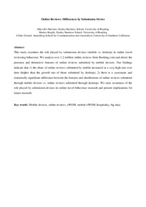 This study examines the role played by submission devices (mobile vs. desktop) in online travel reviewing behaviour. We analyse over 1.2 million online reviews from Booking.com and detect the presence and distinctive features of online reviews submitted by mobile devices. Our findings indicate that 1) the share of online reviews submitted by mobile increased at a very high rate over time (higher than the growth rate of those submitted by desktop); 2) there is a systematic and statistically significant difference between the features and distributions of online reviews submitted through mobile devices vs. online reviews submitted through desktops. We raise awareness of the role played by submission devices in online travel behaviour research and present implications for future research.