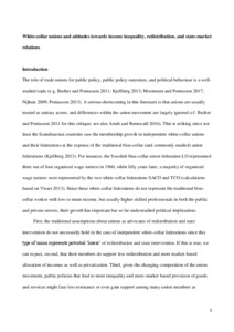 The role of trade unions for public policy, public policy outcomes, and political behaviour is a well-studied topic. A serious shortcoming in this literature is that unions are usually treated as unitary actors. This is striking since not least the Scandinavian countries saw the membership growth in independent white-collar unions and their federations at the expense of the traditional blue-collar (and thus textbook-style) union federations. The growth of independent white-collar unions implies that the traditional assumptions about unions as advocates of redistribution and state intervention do not necessarily hold because this type of union represents potential ‘losers’ of redistribution and intervention. Moreover, their members do support less redistribution and more market-based allocation of incomes as well as privatization since the solidarity effect fostered by traditional unionism is weakened if the higher income strata is organized in separate federations. Consequently, this study addresses an important gap in the literature on union membership and political preferences by analysing the attitudes towards redistribution and state-market relations in Denmark, Norway, and Sweden across union federation membership in the last three decades. The findings demonstrate that members of independent academic/professional unions support market allocation of incomes and less state intervention, while the opposite is true for members of traditional blue-collar union federations. The effect of income on attitudes towards state and market is also consistently stronger in the independent white-collar federations in the three countries, which supports the muted solidarity effect in this type of union.