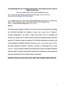Watkins, R. D., Denegri-Knott, J. and Molesworth, M. (2016) The relationship between ownership and possession: observations from the context of digital virtual goods. Journal of Marketing Management, 32 (1-2). pp. 44-70. ISSN 1472-1376 doi: 10.1080/0267257X.2015.1089308