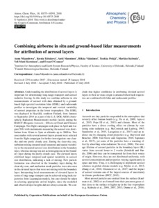 Nikandrova, A., Tabakova, K., Manninen, A., Väänänen, R., Petäjä, T., Kulmala, M., Kerminen, V.-M. and O'Connor, E. (2018) Combining airborne in situ and ground-based lidar measurements for attribution of aerosol layers. Atmospheric Chemistry and Physics, 18. pp. 10575-10591. ISSN 1680-7316 doi: 10.5194/acp-18-10575-2018