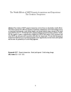 Prior studies of REIT property transaction activity focus on shareholder wealth effects. This study examines the effects of property acquisitions, dispositions, and overall trading activity on unsecured bond spreads, credit rating changes, and rating outlooks using a sample of the listed equity REITs in the U.S. We find that active property trading in general decreases creditors’ wealth, but this negative impact is significantly mitigated for REITs with positive NAV premiums and when REITs use sale proceeds to pay down debt after the transactions. We also find that property transactions followed by an increased geographic focus significantly increase bond yield spreads and decrease the probability of credit rating upgrades.
