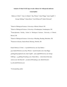Poole, R. L., Barker, G. L. A., Werner, K., Biggi, G. F., Coghill, J., Gibbings, G., Berry, S., Dunwell, J. ORCID: https://orcid.org/0000-0003-2147-665X and Edwards, K. J. (2008) Analysis of wheat SAGE tags reveals evidence for widespread antisense transcription. BMC Genomics, 9. 475. ISSN 1471-2164 doi: 10.1186/1471-2164-9-475