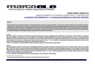 Romo Simon, F. (2015) La instrucción gramatical y la lengua materna en la era post-método. MarcoELE, 2015 (21). ISSN 1885-2211