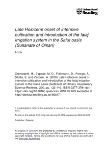 Cremaschi, M., Esposti, M. D., Fleitmann, D., Perego, A., Sibilia, E. and Zerboni, A. (2018) Late Holocene onset of intensive cultivation and introduction of the falaj irrigation system in the Salut oasis (Sultanate of Oman). Quaternary Science Reviews, 200. pp. 123-140. ISSN 0277-3791 doi: 10.1016/j.quascirev.2018.09.029
