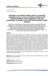 The present scientific opinion deals with the evaluation of the safety of di‐calcium malate (DCM) proposed as a novel food ingredient and as a source of calcium for use in foods for the general population, food supplements, total diet replacement for weight control and food for special medical purposes (FSMP), and with the bioavailability of calcium from this source. The structural formula of the proposed complex is based on expert judgement and not supported by any analytical data. On the basis of the available data, the Panel concluded that there was insufficient scientific evidence of a difference between the proposed novel food ingredient named as di‐calcium malate (DCM) and calcium malate already authorised as a source of calcium included in Annex II to Directive 2002/46/EC. Accordingly, the Panel was unable to assess the safety of DCM as a novel food ingredient. On the basis of the results provided, the Panel considered that DCM does not completely dissociate into calcium and malic acid. The Panel concluded that when DCM dissociates, calcium would be available following ingestion of DCM and the bioavailability would appear similar to values reported for other sources of calcium already permitted. Furthermore, the Panel concluded that on the basis of the information available it was not possible to calculate the exposure to DCM as a source of calcium to foods for the general population, food supplements, total diet replacement for weight control and FSMP.