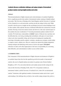 The internationalisation of higher education and current dominance of academic English has led to a significant growth in the number of international students studying in English medium universities. The University of Reading in the United Kingdom and the University of Auckland in New Zealand are two such universities, and they provide the settings for this study. While research to date has given us insights into the psychological and socio-cultural challenges faced by these students, their academic discourse socialisation difficulties have attracted less research attention. Drawing on data from narrative frames and interviews, this study explored aspects of the academic discourse socialisation of 31 incoming international graduate students from 20 countries. We found many commonalities in students’ reports of their previous experience and the difficulties they were facing, including their unfamiliarity with aspects of source-based, critical, and writer-responsible writing, and self-perceived inadequacies regarding their knowledge of discipline-specific academic vocabulary, metadiscourse strategies, and the ability to compose concise, coherent texts. However, students also reported developing independent learning strategies and identifying useful sources of advice and support. Participants’ reflections revealed a self-critical appreciation of and sense of responsibility for overcoming their difficulties, and a determination to achieve success in their studies.