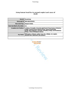 Despite the common association of human lice with abandoned or neglected people, no procedure to assess pediculosis, aimed to detect signs of neglect, exists. Investigating the two most common forms of head louse infestation, regular and severe, we define lice-markers of neglect and develop a protocol and survey form to record and assess pediculosis. The study of head lice from a deceased victim of neglect helped unravel time-length since death, frequency of exposure to neglect and the cause and circumstances related to the death. Nit-clusters are markers of neglect, indicating length and frequency of neglect episodes. In the case study used here that culminated in the death of the victim, sustained abandonment started circa 2 years before discovery. The lice suggested that death was caused by overconsumption of a powerful calcium channel blocker (CCB), an antihypertensive, an excess of which in lice food supply (blood) stops oogenesis. Despite hosting thousands of adult females on the hair, lice reproduction stopped and nits were no longer developed or deposited on the hairs at the root end. This short distance of the shaft with no nits provided a time estimation of overdosing of almost 2 months before death.