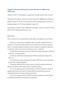 James, A. C., Reardon, T., Soler, A., James, G. and Creswell, C. (2018) Cognitive behavioural therapy for anxiety disorders in children and adolescents. Cochrane Database of Systematic Reviews (10). CD013162. ISSN 1465-1858 doi: 10.1002/14651858.CD013162