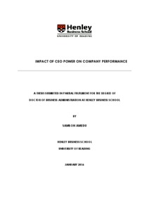 Amedu, S. (2016) Impact of CEO power on company performance. DBA thesis, Henley Business School, University of Reading.